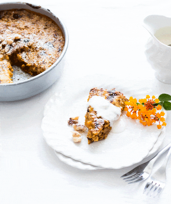 I came up with this baked pumpkin pie oatmeal as an alternative to overnight oats so that we can have something to warm our bellies in the morning. It has been a great hit, especially with the toddler who has been waking up asking for pumpkin pie ever since she tried it. Even the hubby (who weirdly doesn’t buy into the whole pumpkin flavored everything???) said it tastes like Christmas in a bowl, which can only be a good thing.