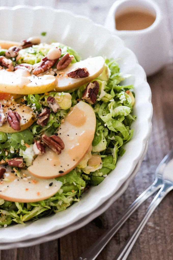 You are going to love this seasonal Miso Brussels Sprouts and Apple Salad. Thinly sliced brussels are given a quick marinade in a light miso dressing and then combined with some fresh crispy apples and toasted pecans. A light and zesty salad that is the perfect accompaniment to some grilled salmon or tofu.
